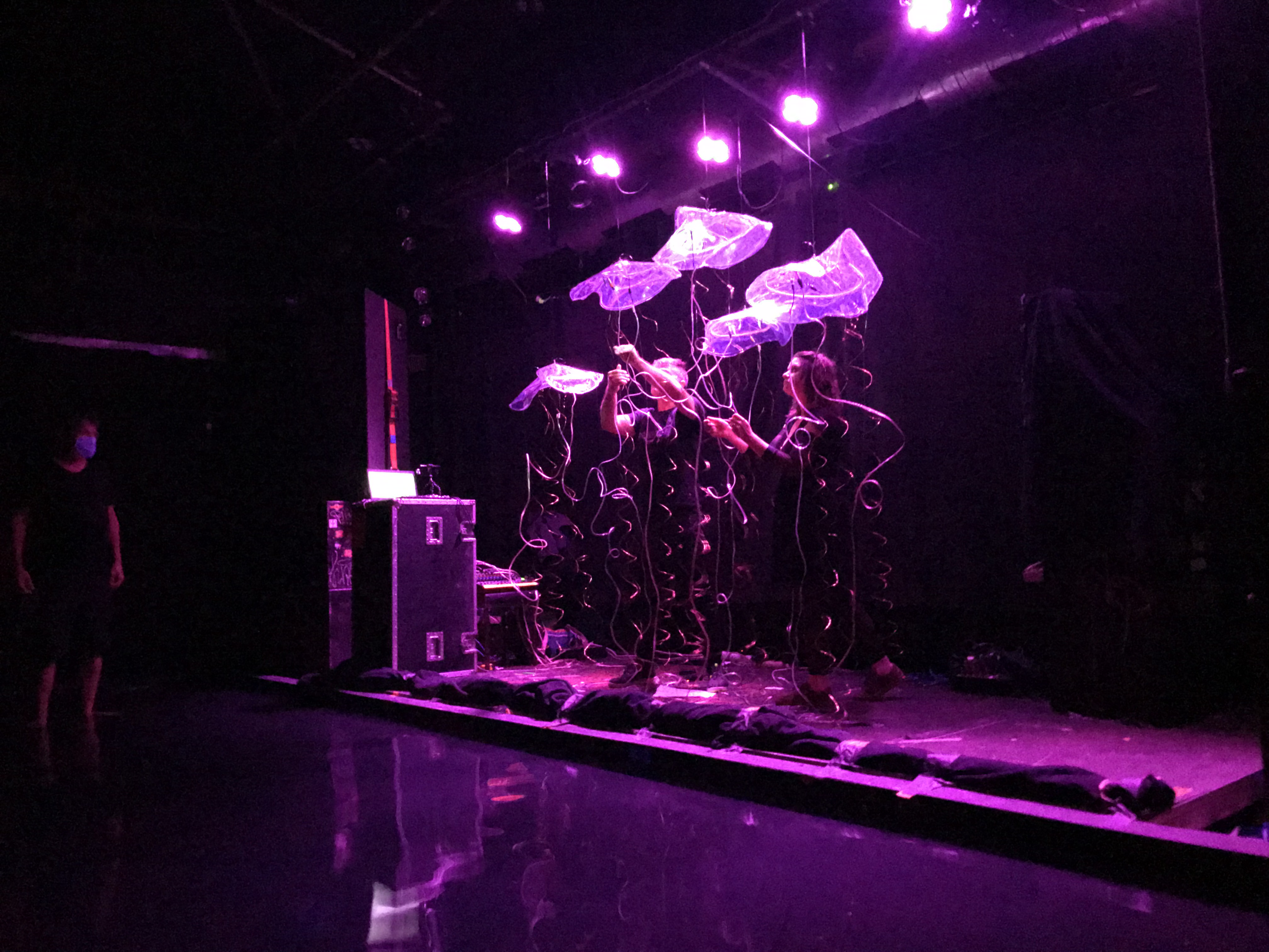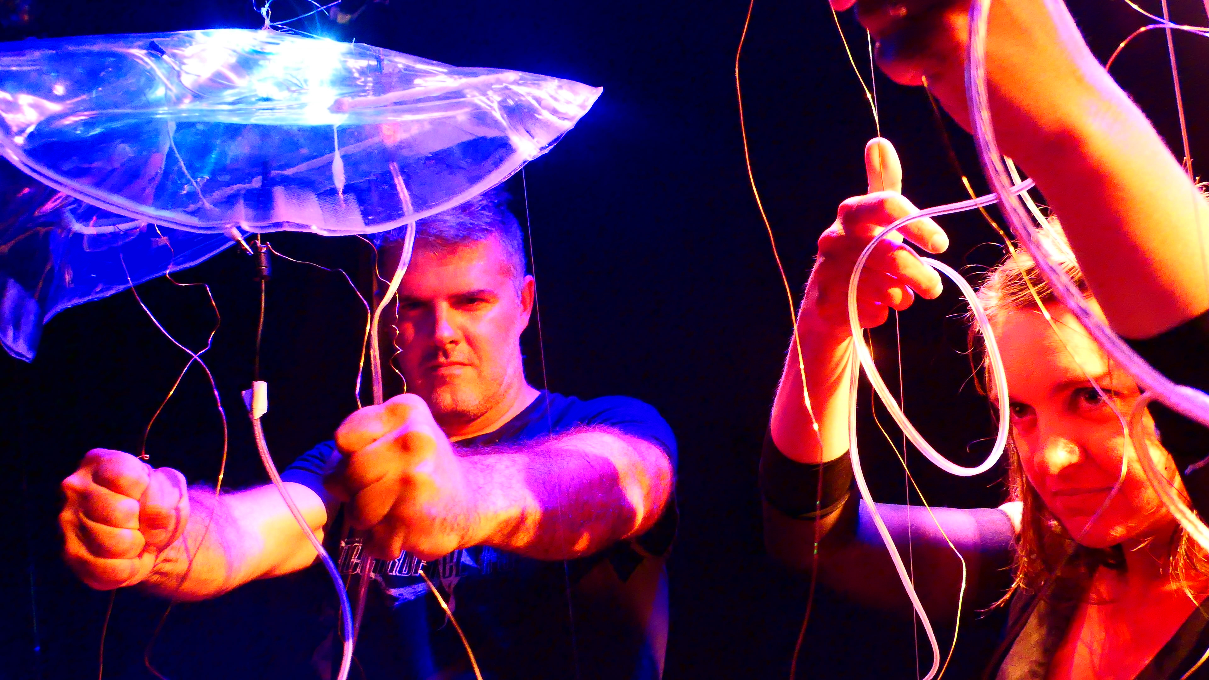 Ausgehend von der Idee eines Quallen-Sensoriums als Warnsystem und Ausgangspunkt wurden diese DIY-Instrumente und eine Komposition für BLOOMS entwickelt. Quallen bestehen aus einem riesigen Nervensystem, das wir uns für unsere Performance als eine Art Audio-Synthesizer vorgestellt haben. Die Performance erforscht chaotische Muster und nutzt absurde elektronische Schaltkreise, um autonome modulare Instrumente herzustellen, die den Raum durch die Erzeugung von Klang, Licht und Bewegung beeinflussen. Die spezifische Virtuosität dieser Instrumente entsteht durch Berührung: Die „Jelly-Synths“ werden mit taktilen Gesten und Berührungen auf Messingdrähten gespielt, die sowohl auf den Schweiß als auch auf den Druck der Haut reagieren.