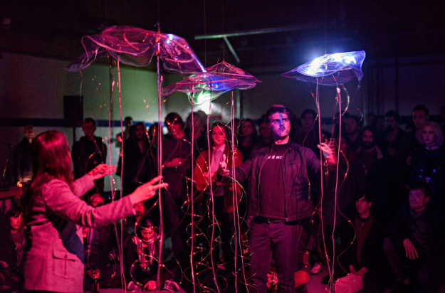 Nach dem Anthropozän erhebt sich das Ctenocene! BLOOMS ist eine Performance, die mit elektronischen DIY-Instrumenten futuristisch-dystopische Klanglandschaften erforscht, indem sie sich der Ökologie der Meere und einer Invasion der Quallen widmet.