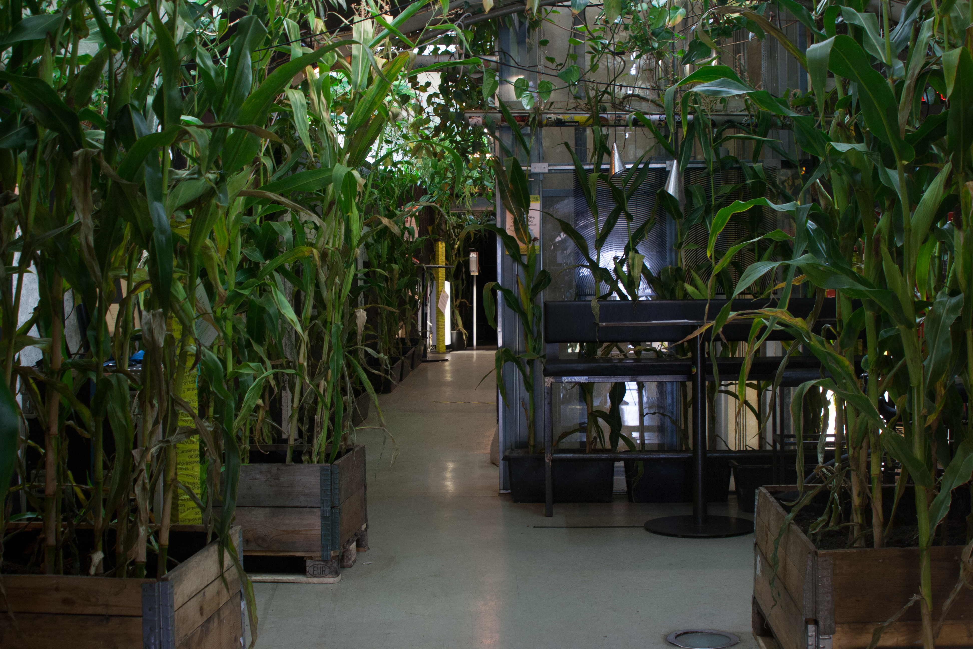 Mais und Maispflanzen im Haus: Die Stadtwerkstatt zeigt im Eingangsbereich und an verschiedenen Orten des Hauses ein Natur- und Kultur-Monotonia als Inszenierung mit kritischer Agency.