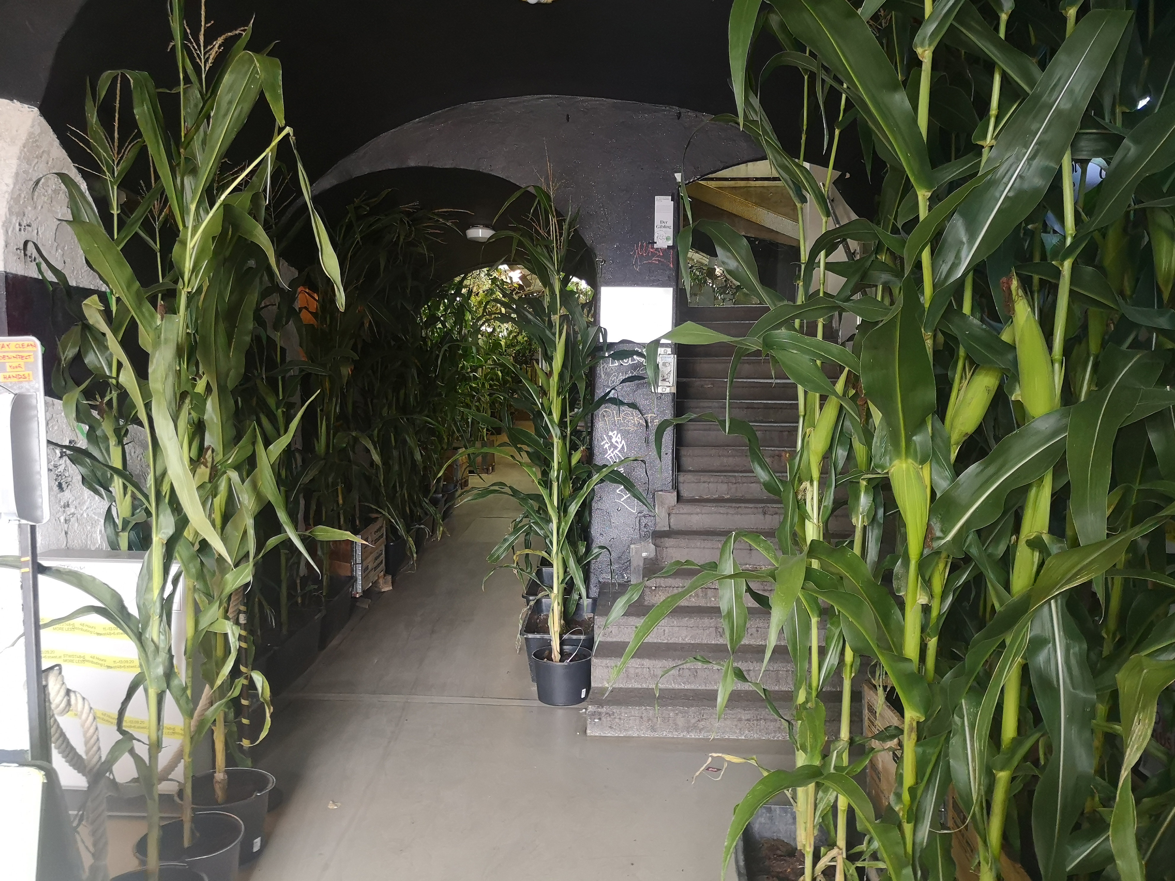 Mais und Maispflanzen im Haus der Stadtwerkstatt: Im Frühjahr wurden in der STWST einige Körner Mais ausgepflanzt. Es folgten Testpflanzungen und Feldbeobachtungen mit dem Mais, einer der ältesten Kulturpflanzen der Welt. Der Mais ist über die Jahrhunderte und Kontinente migriert und zieht nun im Rahmen von STWST48x6 MORE LESS zwischen Post-Anthropozän und Parallelwelt-Chtuluzän als „Natur“ ins STWST-Gebäude ein. Es handelt sich aber nicht um eine wild-wuchernde, „freie“ Natur, sondern um eine regulierte, optimierte, hochgezüchtete Monokultur. Vom Maisanbau früher Kulturen über einen DIY-Anbau bis zur Hochertragsgeschichte von Mon-suck-santo: Mit der Maispflanze, die zwischen Nutzpflanze, Lebensmittelindustrie und Hochtechnologisierungs-Prozessen steht, zeigen wir im Eingangsbereich und an verschiedenen Orten des Hauses ein Natur- und Kultur-Monotonia als Inszenierung mit kritischer Agency. Parallel dazu laufen die Besucher und Besucherinnen durchs Haus – in ihrer Erinnerung immer noch unschuldige Kinder in Kukuruzfeldern, die sich an Rückzug und Orientierungslosigkeit berauschen.