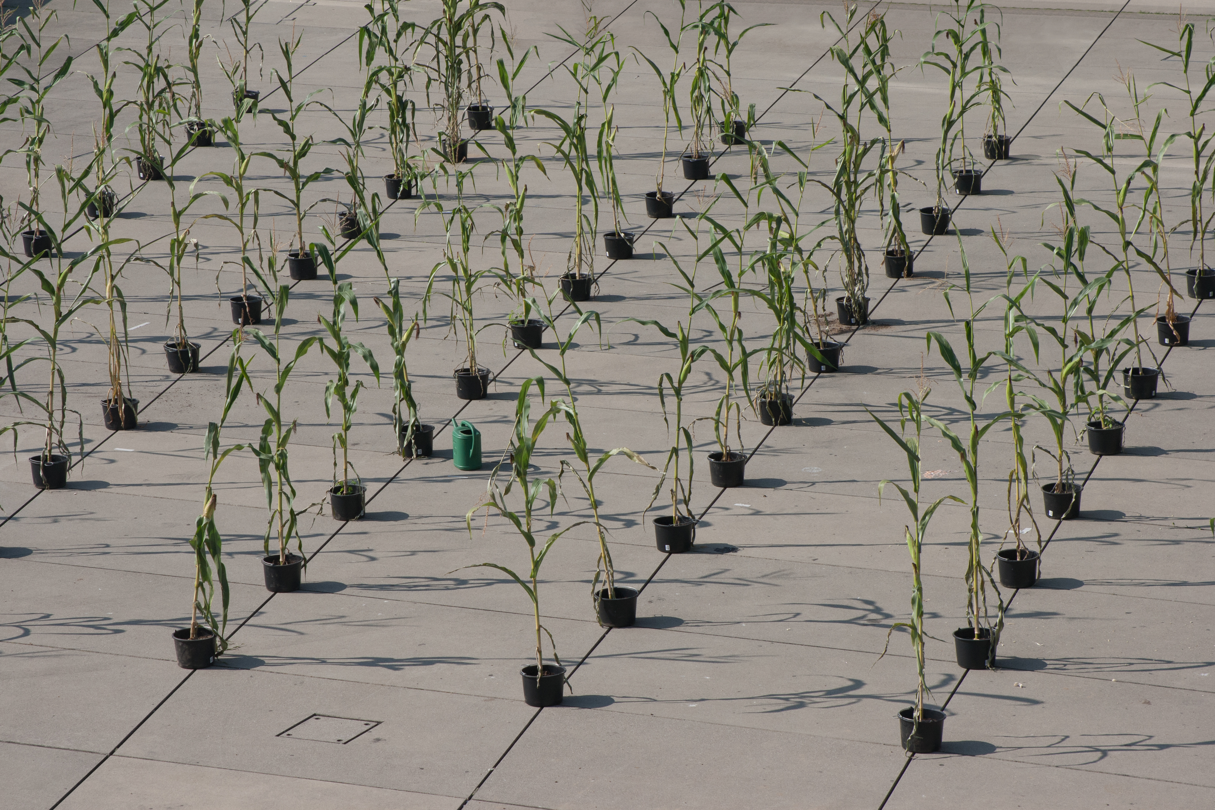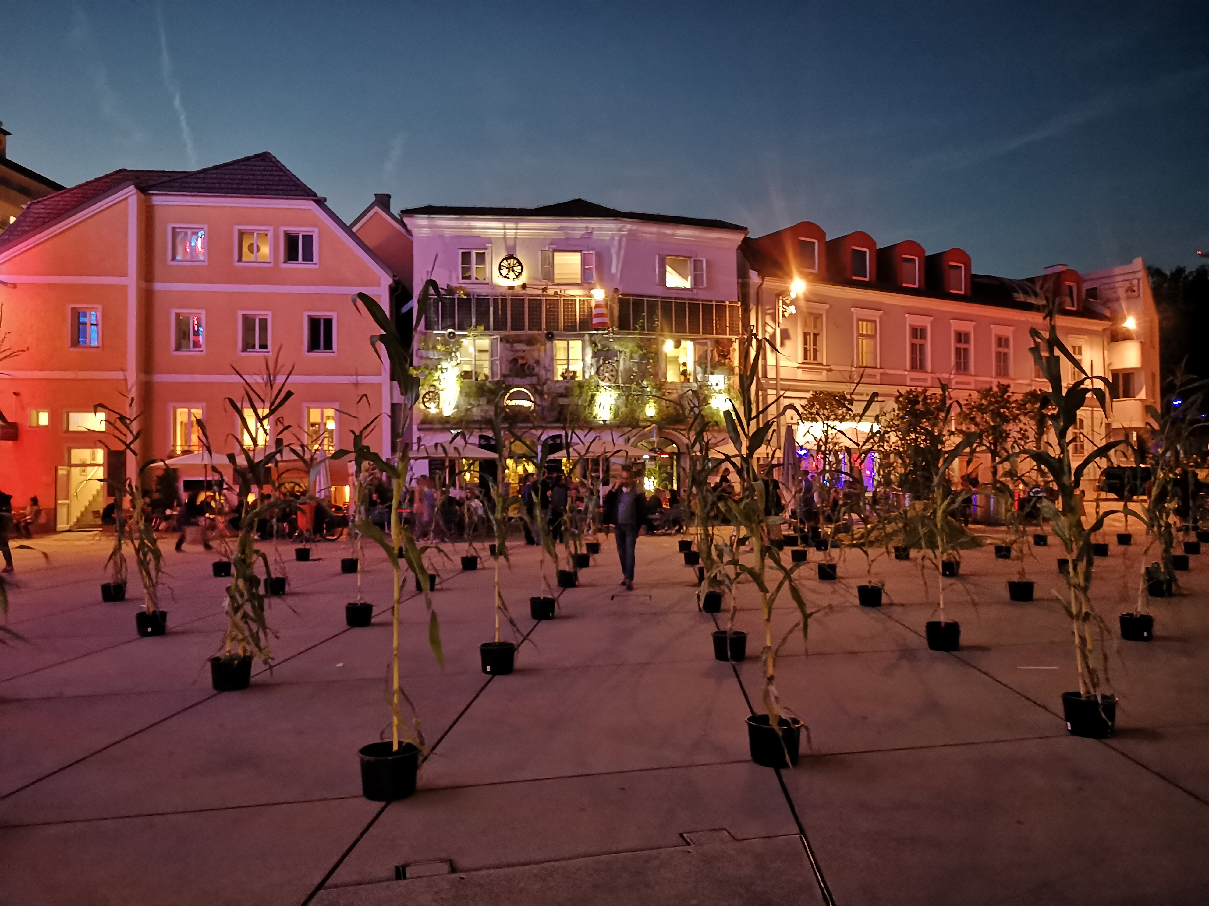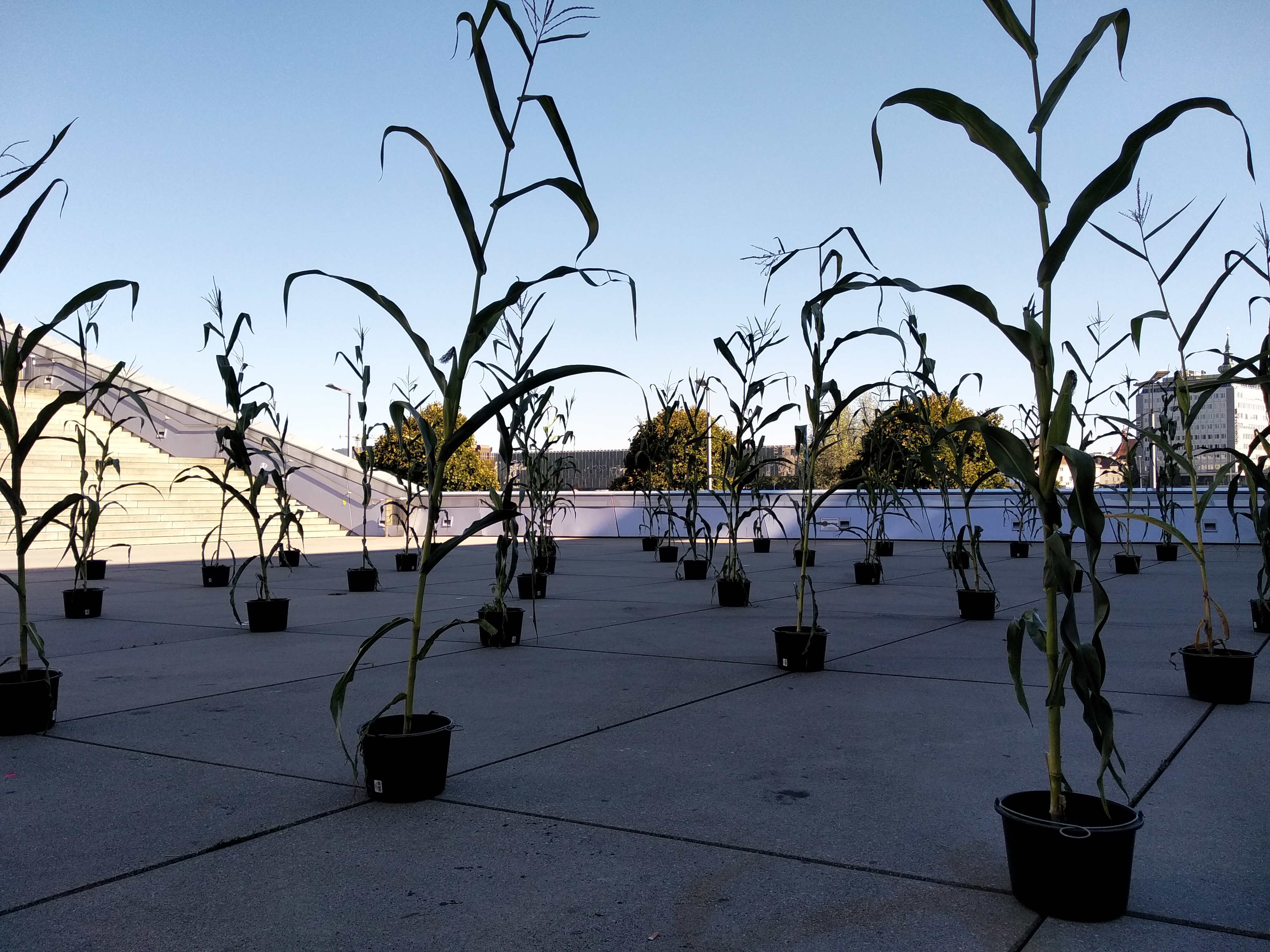 Die Monotonie von Maisfeldern im Zeichen von MORE LESS und Nature and Culture Monotonia: Am Maindeck vor der STWST ist ein Feld aus sozial distanziertem Mais aufgestellt. Der Mais wird mit Sounds bespielt - von Alienation bis Rave.